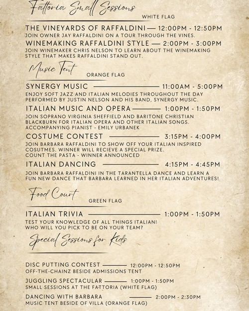 Get ready to indulge in some of the best Italian cuisine at this year’s Festa Italiana! Our food trucks will be serving up a delicious variety of dishes, from wood-fired pizzas and gourmet pasta to sweet treats that will transport your taste buds straight to Italy. Join us at Raffaldini Vineyards for a day of celebrating Italian culture, where you can enjoy authentic flavors, fresh ingredients, and a festive atmosphere. Whether you're a foodie or just love great food, the Festa Italiana is the perfect place to savor all things Italian.