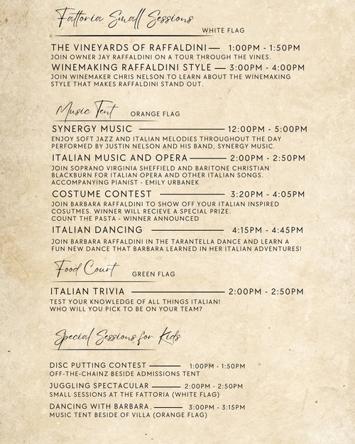 Our biggest event of the year returns! The epicenter of Italian culture in the Piedmont is here on Saturday, September 20 and Sunday, September 21 as food vendors, musicians, artists, and craftsmen from across the region descend on Chianti in the Carolinas for this annual outdoor celebration of Italian culture, food, art, music, and of course, wine. Enjoy the festival atmosphere or join one of our breakout sessions featuring in depth discussions with Jay Raffaldini and our team on winemaking, vineyard, Italian trivia and more! More info to come soon on this page!